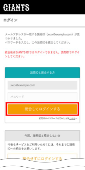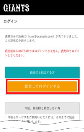 お持ちのGIANTS IDまたは登録メールアドレスとパスワードを入力し、「統合してログインする」をタップ