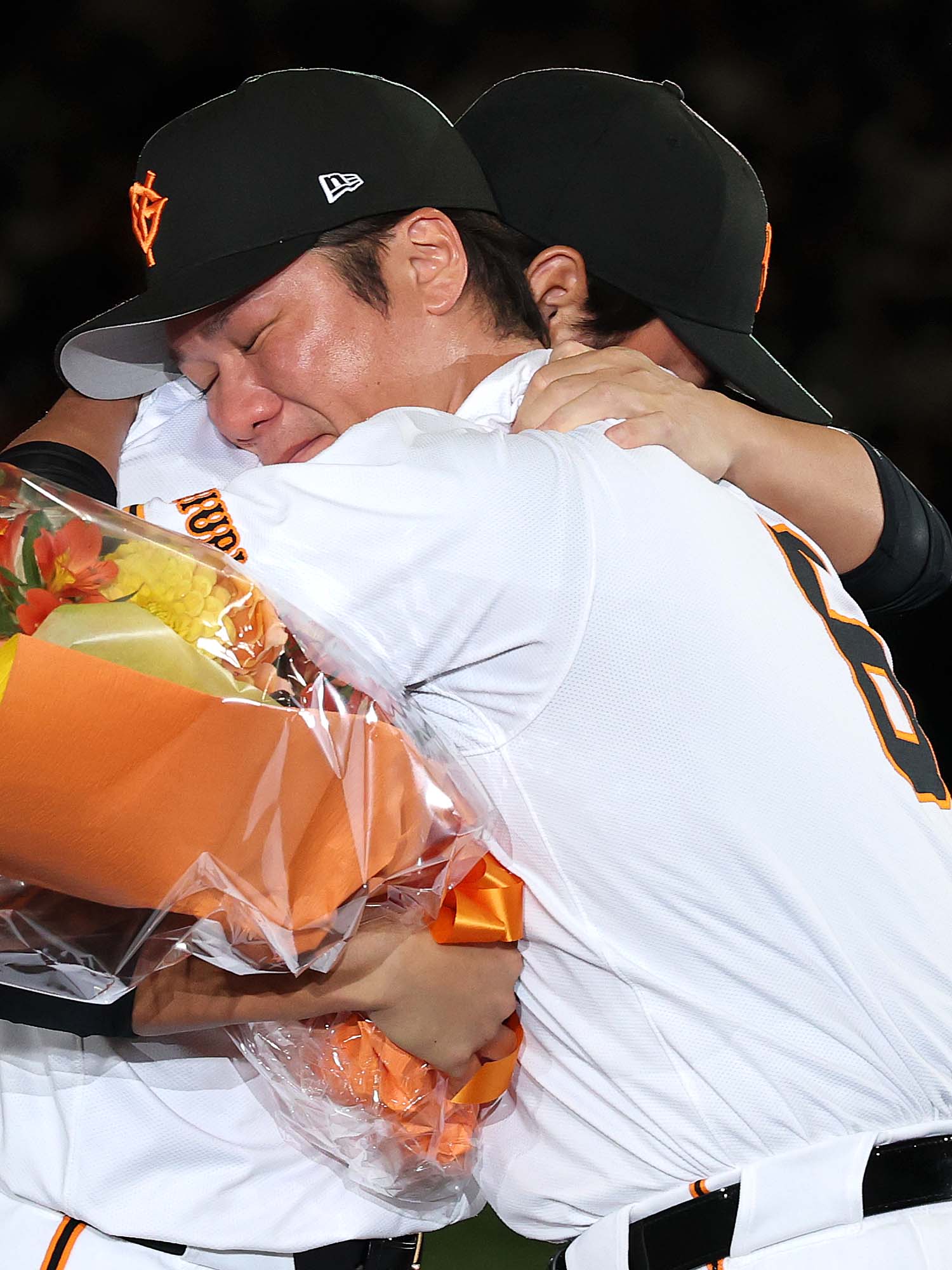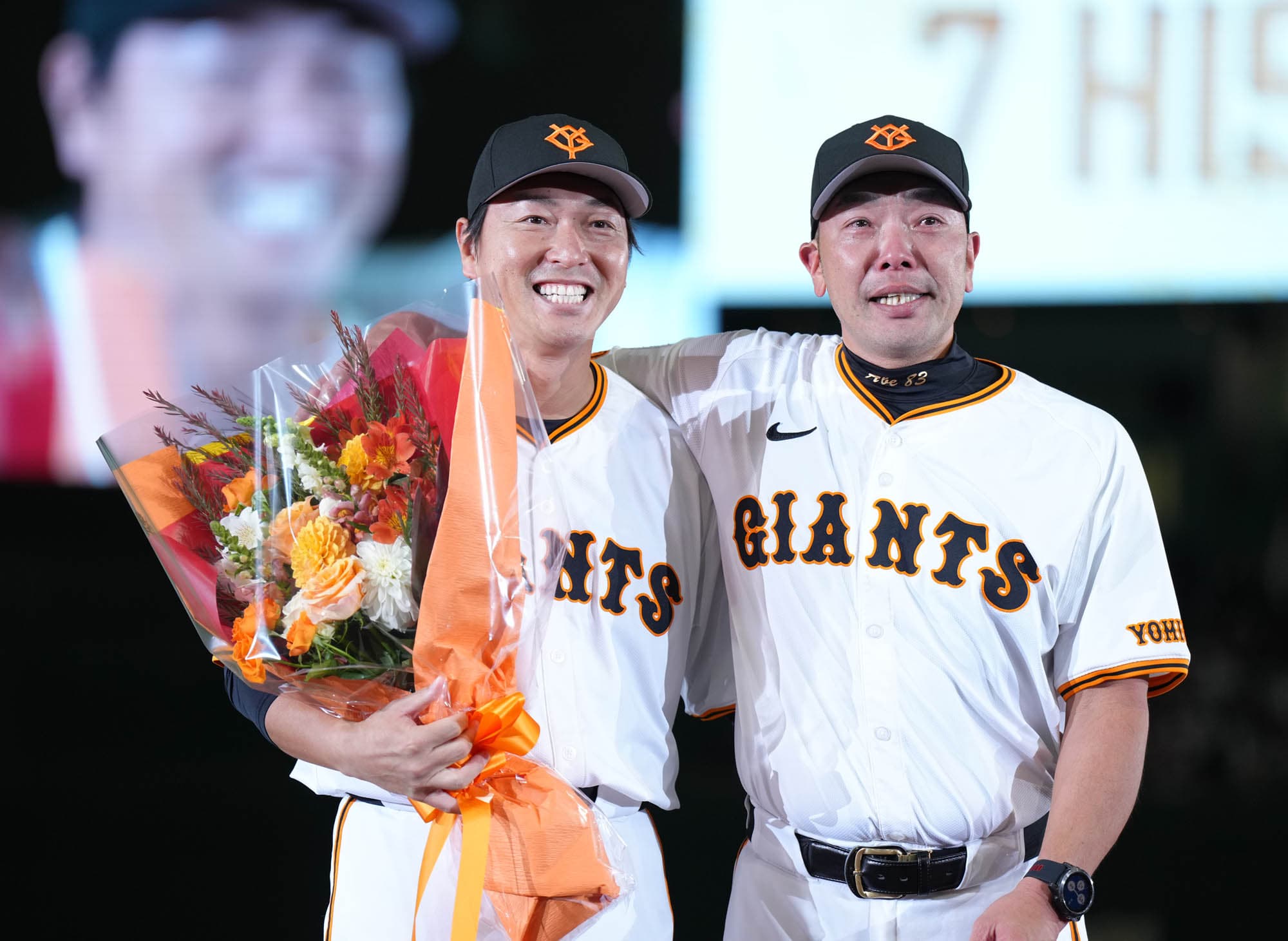 阿部監督と坂本選手は大粒の涙を見せ、ここまで笑顔だった長野選手の目にも光るものが。それぞれと固く抱きしめ合う姿にスタンドのファンも涙が溢れて止まらない様子。