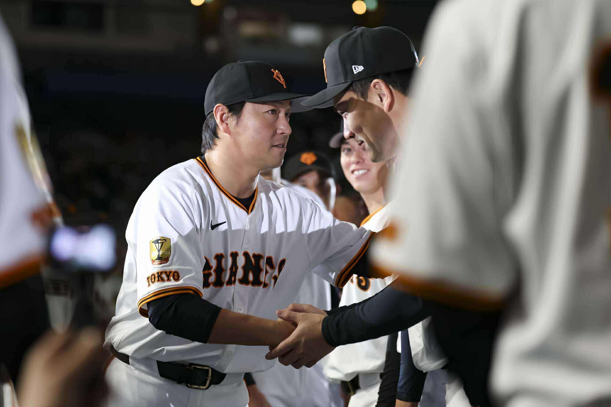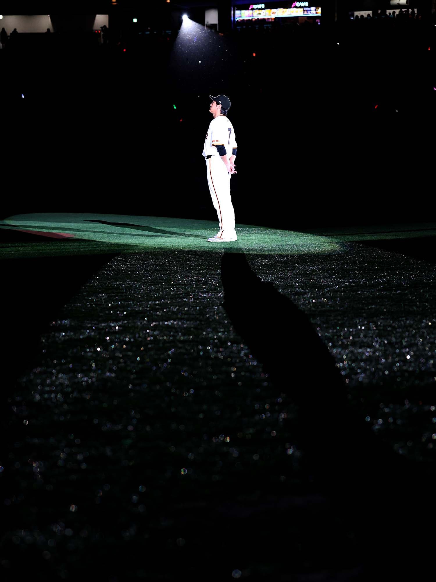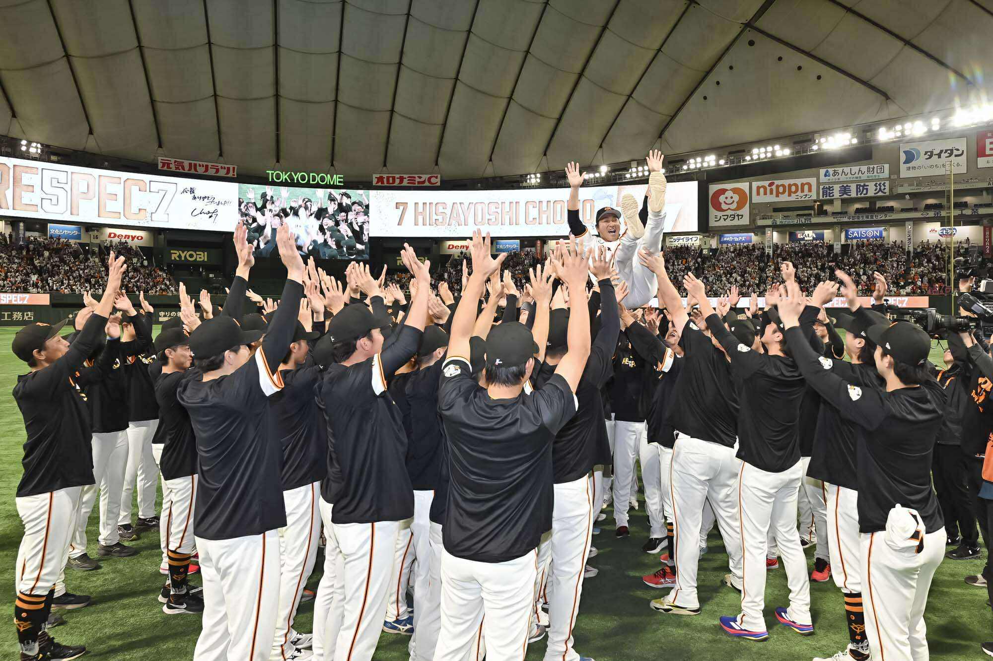選手ひとりひとりと固い握手を交わし、場内を一周してファンに別れを告げたあとは、胴上げ。ここで長野選手は、ポスティングシステムを利用し米大リーグ移籍を目指す岡本和真選手の腕を引っ張って中央に引きずり込んで、強制的に胴上げを敢行。その後、ようやく長野選手の出番となり、背番号と同じ7回、宙に舞いました。