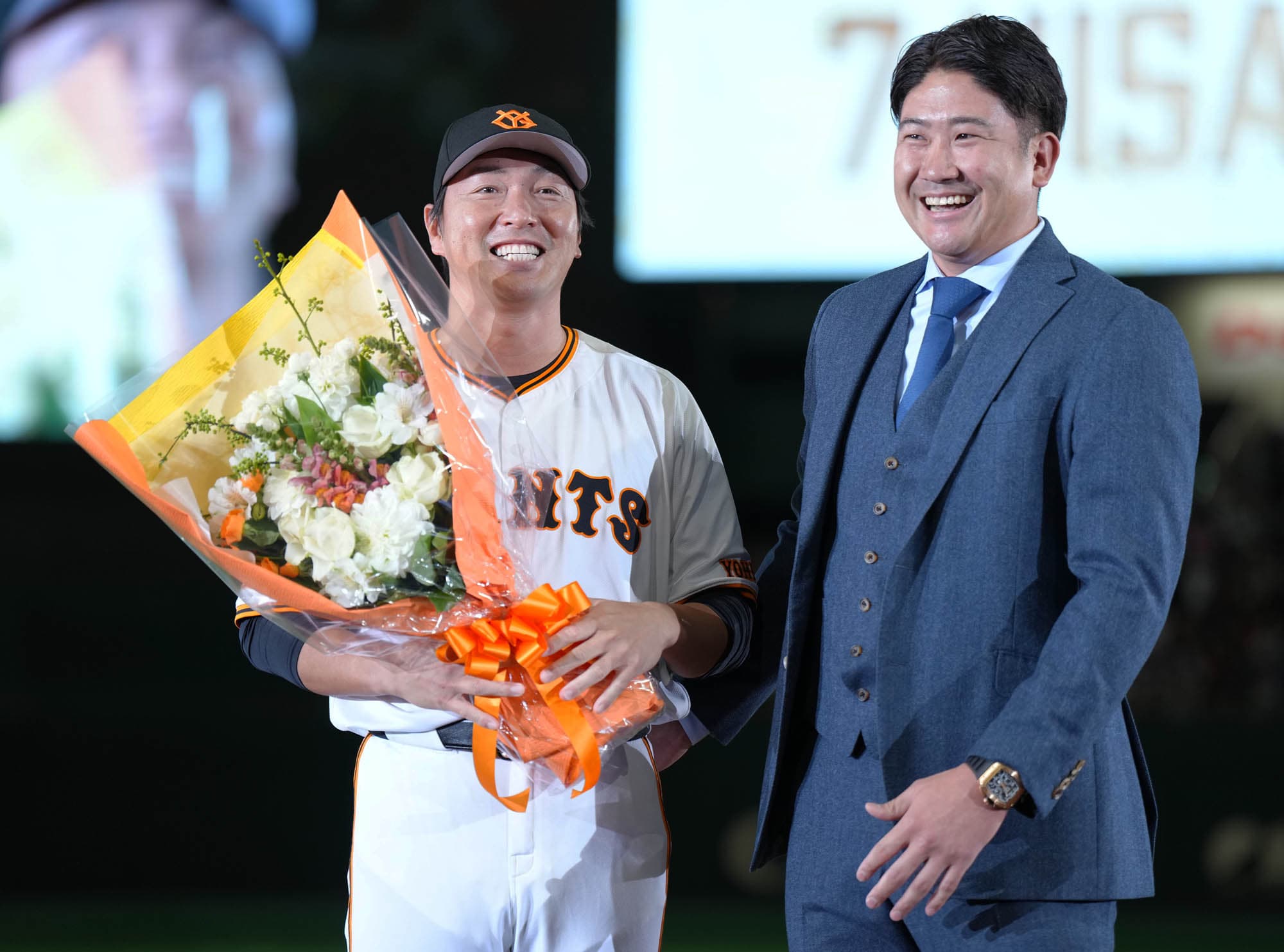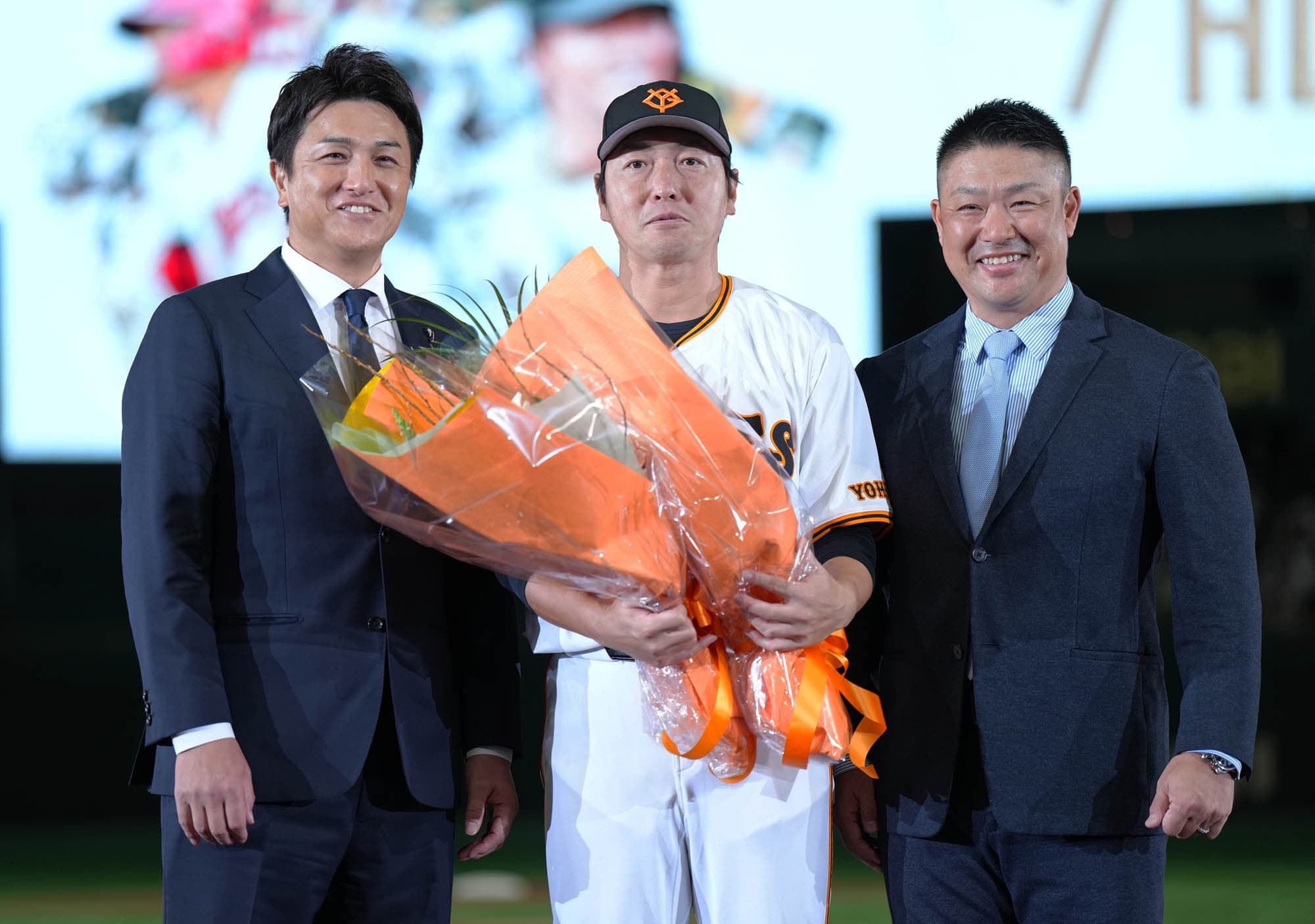 花束は、阿部慎之助監督、高橋由伸さん、村田修一さん、今季米オリオールズでプレーした菅野智之さん、坂本勇人選手から贈られました。
